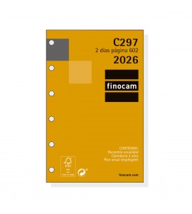 Recambio anual para las agendas de anillas Finocam Classic. Con esquinas microperforadas para localizar rápidamente el día/semana en curso. La anualidad contiene los festivos nacionales y la onomástica.