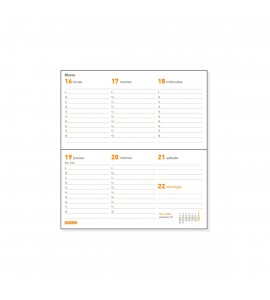 Recambio anual para agendas encuadernadas de bolsillo Finocam Plana. Con esquinas microperforadas para localizar rápidamente el día/semana en curso. La anualidad contiene los festivos nacionales.
