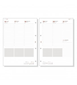 Las esquinas son microperforadas para localizar rápidamente el día/semana en curso. El recambio incluye plan anual y meses complementarios extra.