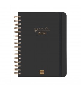 Agenda de espiral de tapa dura de cartón forrado con peliculado mate antirrayaduras y efecto soft touch. Diseño elegante y sofisticado con detalles estampados metalizados. Ideal para uso personal y/o profesional. Con goma elástica y esquinas microperforadas para localizar rápidamente el día/semana en curso. Incorpora un set de adhesivos temáticos. El diseño interior es limpio y fácil, con espacio suficiente para organizar tus proyectos, tareas y compromisos. Contiene información de interés en la anualidad y otros contenidos extra orientados a la organización personal.