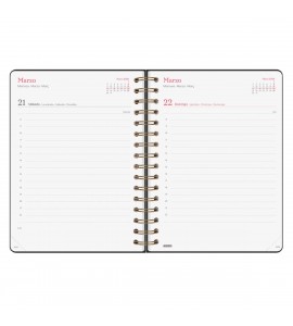 Agenda de espiral de tapa dura de cartón forrado con peliculado mate antirrayaduras y efecto soft touch. Diseño elegante y sofisticado con detalles estampados metalizados. Ideal para uso personal y/o profesional. Con goma elástica y esquinas microperforadas para localizar rápidamente el día/semana en curso.