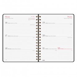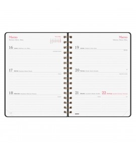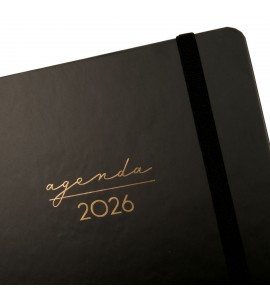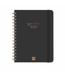 Agenda de espiral de tapa dura de cartón forrado con peliculado mate antirrayaduras. Diseño elegante y sofisticado con detalles estampados metalizados. Ideal para uso personal y/o profesional. Con goma elástica y esquinas microperforadas para localizar rápidamente el día/semana en curso.