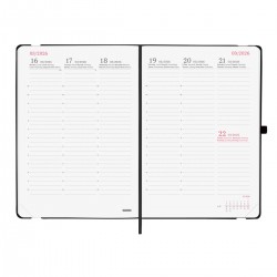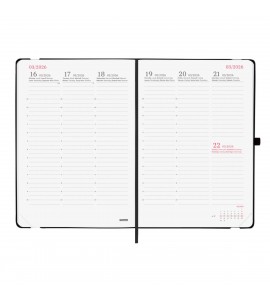 Agenda encuadernada de tapa blanda de tacto suave y agradable. Diseños en tendencia y a la moda con detalles estampados metalizados. Ideal para uso personal y/o profesional. Con cinta punto y bolsillo interior con fuelle de papel tejido muy resistente al uso. También goma elástica y anilla portabolígrafo para llevar siempre contigo un elemento de escritura. Apertura perfecta para poder escribir cómodamente y esquinas microperforadas para localizar rápidamente el día/semana en curso. El diseño interior es limpio y fácil, con espacio suficiente para organizar tus proyectos, tareas y compromisos. La agenda incluye información de interés en la anualidad y otros contenidos extra orientados a la organización personal.