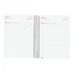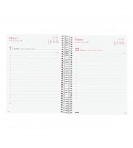 Agenda de espiral con tapas de polipropileno. Diseño en tendencia y a la moda. Ideal para uso personal y/o profesional. Con goma elástica. Con esquinas microperforadas para localizar rápidamente el día/semana en curso. La anualidad contiene la información útil relativa a: onomástica, festivos nacionales, cambios de estación y cambios de hora. La agenda incluye otros contenidos extra orientados a la organización personal. El diseño interior es limpio y fácil, con espacio suficiente para organizar tus proyectos, tareas y compromisos.