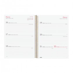 · Contenido: La anualidad de la agenda incluye la información relativa a: onomástica, festivos nacionales, cambios de estación e inicios de los años nuevos chino, musulmán, ortodoxo y hebreo. La agenda dispone también de otros contenidos extra: datos personales, calendarios, horarios, objetivos del año, plan anual, fechas importantes, otras fechas, hojas para checklist, hojas para notas, hoja para ocio y hojas para teléfonos, direcciones y e-mails.