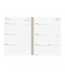 Agenda de espiral con tapas ligeras de polipropileno. Diseño en tendencia y a la moda. Ideal para uso personal y/o profesional. Con goma elástica. Con esquinas microperforadas para localizar rápidamente el día/semana en curso. El diseño interior es limpio y fácil, con espacio suficiente para organizar tus proyectos, tareas y compromisos. Agenda con información de interés en la anualidad y otros contenidos extra orientados a la organización personal.
