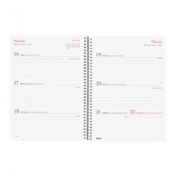 Agenda de espiral con tapas ligeras de polipropileno. Diseño en tendencia y a la moda. Ideal para uso personal y/o profesional. Con goma elástica. Con esquinas microperforadas para localizar rápidamente el día/semana en curso. El diseño interior es limpio y fácil, con espacio suficiente para organizar tus proyectos, tareas y compromisos. Agenda con información de interés en la anualidad y otros contenidos extra orientados a la organización personal.