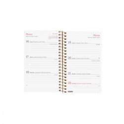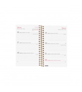 Agenda de espiral con tapas ligeras de polipropileno. Diseño en tendencia y a la moda. Ideal para uso personal y/o profesional. Con goma elástica. Con esquinas microperforadas para localizar rápidamente el día/semana en curso. El diseño interior es limpio y fácil, con espacio suficiente para organizar tus proyectos, tareas y compromisos. Agenda con información de interés en la anualidad y otros contenidos extra orientados a la organización personal.
