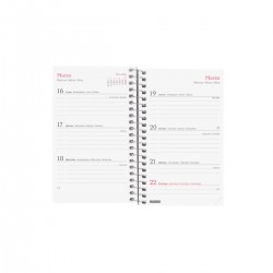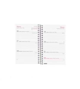 Agenda de espiral con tapas ligeras de polipropileno. Diseño en tendencia y a la moda. Ideal para uso personal y/o profesional. Con goma elástica. Con esquinas microperforadas para localizar rápidamente el día/semana en curso. El diseño interior es limpio y fácil, con espacio suficiente para organizar tus proyectos, tareas y compromisos. Agenda con información de interés en la anualidad y otros contenidos extra orientados a la organización personal.