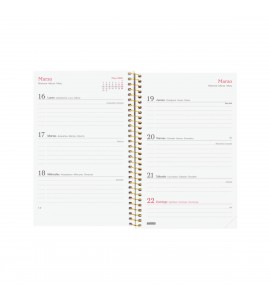 Agenda de espiral con tapas de polipropileno. Diseño en tendencia y a la moda. Ideal para uso personal y/o profesional. Con goma elástica. Con esquinas microperforadas para localizar rápidamente el día/semana en curso. La anualidad contiene la información útil relativa a: onomástica, festivos nacionales, cambios de estación y cambios de hora. La agenda incluye otros contenidos extra orientados a la organización personal. El diseño interior es limpio y fácil, con espacio suficiente para organizar tus proyectos, tareas y compromisos.