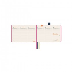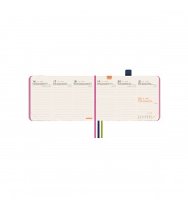 Agenda de tapa dura con diseños en tendencia y a la moda. Perfecta apertura. Con tres cintas-punto de colores y bolsillo interior con fuelle de papel-tejido muy resistente al uso. Con goma elástica y anilla portabolígrafo para llevar siempre contigo un elemento de escritura. Con esquinas microperforadas para localizar rápidamente el día/semana en curso. Para facilitar la localización de cada mes, la anualidad incorpora un indicador en la parte superior de las páginas. La anualidad contiene los festivos nacionales y la onomástica. La agenda incluye otros contenidos extra.