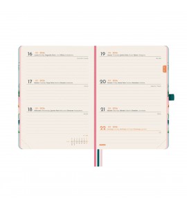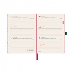 Agenda de tapa dura con diseños en tendencia y a la moda. Apertura perfecta para poder escribir cómodamente. Con tres cintas punto de colores y bolsillo interior con fuelle de papel-tejido muy resistente al uso. Con goma elástica y anilla portabolígrafo para llevar siempre contigo un elemento de escritura. Esquinas microperforadas para localizar rápidamente el día/semana en curso. Para facilitar la localización de cada mes, la anualidad incorpora un indicador en el lateral derecho de las páginas. La anualidad contiene información de interés y otros contenidos extra.