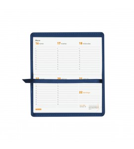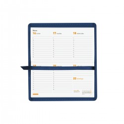 Agenda encuadernada de bolsillo con cubierta. Muy ligera y práctica. Elegante y moderna. Con cinta-punto. Con esquinas microperforadas para localizar rápidamente el día/semana en curso. La anualidad contiene los festivos nacionales. Esta agenda permite cambiar anualmente el recambio.