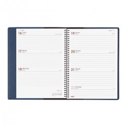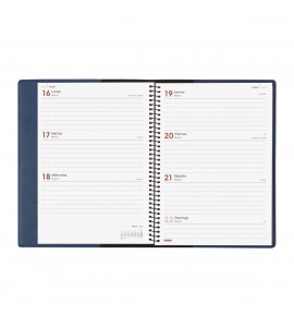 Agenda de espiral con cubierta. Diseño elegante y juvenil. Ideal para la oficina o para un uso personal. Con bolsillo interior. Equipada con un bloc de notas independiente para disponer siempre de hojas en blanco (también disponible como recambio). Cierre con goma elástica. Con esquinas microperforadas para localizar rápidamente el día/semana en curso. La anualidad contiene la información útil relativa a: onomástica, festivos nacionales, cambios de estación, cambios de hora e inicios del nuevo año chino, musulmán, ortodoxo y hebreo. La agenda incluye otros contenidos extra. Además, esta agenda te permite conservar la cubierta sustituyendo anualmente solo la agenda de espiral. Si lo deseas, también podrás reutilizar la cubierta como funda de libro o funda de libreta.