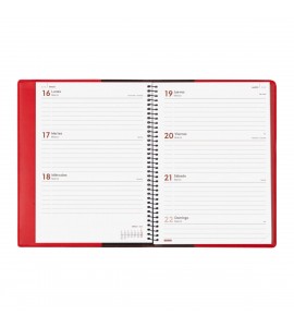Agenda de espiral con cubierta. Diseño elegante y juvenil. Ideal para la oficina o para un uso personal. Con bolsillo interior. Equipada con un bloc de notas independiente para disponer siempre de hojas en blanco (también disponible como recambio). Cierre con goma elástica. Con esquinas microperforadas para localizar rápidamente el día/semana en curso. La anualidad contiene la información útil relativa a: onomástica, festivos nacionales, cambios de estación, cambios de hora e inicios del nuevo año chino, musulmán, ortodoxo y hebreo. La agenda incluye otros contenidos extra. Además, esta agenda te permite conservar la cubierta sustituyendo anualmente solo la agenda de espiral. Si lo deseas, también podrás reutilizar la cubierta como funda de libro o funda de libreta.