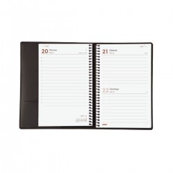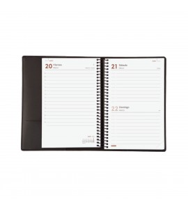 Agenda de espiral con cubierta. Diseño elegante y juvenil. Ideal para la oficina o para un uso personal. Con bolsillo interior. Equipada con un bloc de notas independiente para disponer siempre de hojas en blanco (también disponible como recambio). Cierre con goma elástica. Con esquinas microperforadas para localizar rápidamente el día/semana en curso. La anualidad contiene la información útil relativa a: onomástica, festivos nacionales, cambios de estación, cambios de hora e inicios del nuevo año chino, musulmán, ortodoxo y hebreo. La agenda incluye otros contenidos extra. Además, esta agenda te permite conservar la cubierta sustituyendo anualmente solo la agenda de espiral. Si lo deseas, también podrás reutilizar la cubierta como funda de libro o funda de libreta.