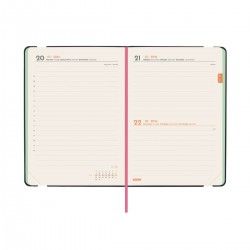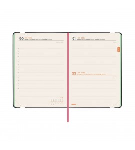 Agenda encuadernada de tapa blanda y flexible. Diseño moderno con carácter. Material de tacto suave y agradable. Apertura perfecta para poder escribir cómodamente. Con cinta punto y bolsillo interior con fuelle de papel-tejido muy resistente al uso. Con goma elástica y anilla portabolígrafo para llevar siempre contigo un elemento de escritura. Esquinas microperforadas para localizar rápidamente el día/semana en curso. Para facilitar la localización de cada mes, la anualidad incorpora un indicador en la parte superior de las páginas. La anualidad incluye información de interés y otros contenidos extra.