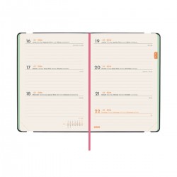 Agenda encuadernada de tapa blanda y flexible. Diseño moderno con carácter. Material de tacto suave y agradable. Apertura perfecta para poder escribir cómodamente. Con cinta punto y bolsillo interior con fuelle de papel-tejido muy resistente al uso. Con goma elástica y anilla portabolígrafo para llevar siempre contigo un elemento de escritura. Esquinas microperforadas para localizar rápidamente el día/semana en curso. Para facilitar la localización de cada mes, la anualidad incorpora un indicador en la parte superior de las páginas. La anualidad incluye información de interés y otros contenidos extra.