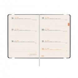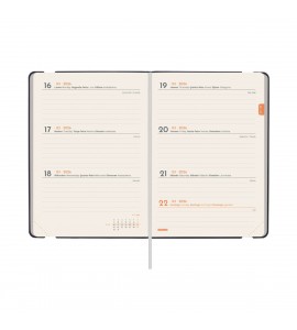 Agenda encuadernada de tapa blanda y flexible. Diseño moderno con carácter. Material de tacto suave y agradable. Apertura perfecta para poder escribir cómodamente. Con cinta punto y bolsillo interior con fuelle de papel-tejido muy resistente al uso. Con goma elástica y anilla portabolígrafo para llevar siempre contigo un elemento de escritura. Esquinas microperforadas para localizar rápidamente el día/semana en curso. Para facilitar la localización de cada mes, la anualidad incorpora un indicador en la parte superior de las páginas. La anualidad incluye información de interés y otros contenidos extra.