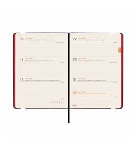 Agenda encuadernada de tapa blanda y flexible. Diseño moderno con carácter. Material de tacto suave y agradable. Apertura perfecta para poder escribir cómodamente. Con cinta punto y bolsillo interior con fuelle de papel-tejido muy resistente al uso. Con goma elástica y anilla portabolígrafo para llevar siempre contigo un elemento de escritura. Esquinas microperforadas para localizar rápidamente el día/semana en curso. Para facilitar la localización de cada mes, la anualidad incorpora un indicador en la parte superior de las páginas. La anualidad incluye información de interés y otros contenidos extra.