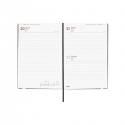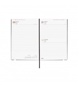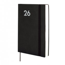 Agenda profesional encuadernada de tapa blanda y flexible. De tacto muy suave y gomoso. De estilo moderno y universal. Apertura perfecta. Con goma elástica y cinta-punto. Con esquinas microperforadas para localizar rápidamente el día/semana en curso. La anualidad contiene la información útil relativa a: onomástica, festivos nacionales, fases lunares, cambios de estación, cambios de hora e inicios del nuevo año chino, musulmán, ortodoxo y hebreo. La agenda incluye otros contenidos extra.