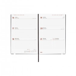 Agenda profesional encuadernada de tapa blanda y flexible. De tacto suave muy agradable. Estilo moderno y universal. Apertura perfecta para poder escribir cómodamente. Con goma elástica y cinta punto. Esquinas microperforadas para localizar rápidamente el día/semana en curso. Agenda con información de interés en la anualidad y otros contenidos extra.