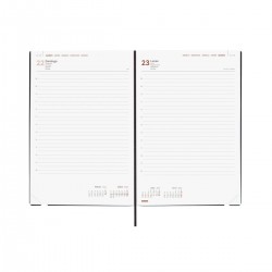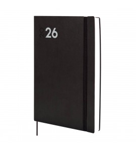 Agenda profesional encuadernada de tapa blanda y flexible. De tacto muy suave y gomoso. De estilo moderno y universal. Apertura perfecta. Con goma elástica y cinta-punto. Con esquinas microperforadas para localizar rápidamente el día/semana en curso. La anualidad contiene la información útil relativa a: onomástica, festivos nacionales, fases lunares, cambios de estación, cambios de hora e inicios del nuevo año chino, musulmán, ortodoxo y hebreo. La agenda incluye otros contenidos extra.