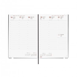 Agenda profesional encuadernada de tapa blanda y flexible. De tacto muy suave y gomoso. De estilo moderno y universal. Apertura perfecta. Con goma elástica y cinta-punto. Con esquinas microperforadas para localizar rápidamente el día/semana en curso. La anualidad contiene la información útil relativa a: onomástica, festivos nacionales, fases lunares, cambios de estación, cambios de hora e inicios del nuevo año chino, musulmán, ortodoxo y hebreo. La agenda incluye otros contenidos extra.