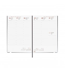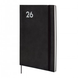 Agenda profesional encuadernada de tapa blanda y flexible. De tacto muy suave y gomoso. De estilo moderno y universal. Apertura perfecta. Con goma elástica y cinta-punto. Con esquinas microperforadas para localizar rápidamente el día/semana en curso. La anualidad contiene la información útil relativa a: onomástica, festivos nacionales, fases lunares, cambios de estación, cambios de hora e inicios del nuevo año chino, musulmán, ortodoxo y hebreo. La agenda incluye otros contenidos extra.