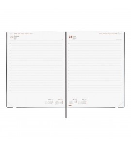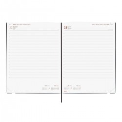 Agenda profesional encuadernada de tapa blanda y flexible. De tacto muy suave y gomoso. De estilo moderno y universal. Apertura perfecta. Con goma elástica y cinta-punto. Con esquinas microperforadas para localizar rápidamente el día/semana en curso. La anualidad contiene la información útil relativa a: onomástica, festivos nacionales, fases lunares, cambios de estación, cambios de hora e inicios del nuevo año chino, musulmán, ortodoxo y hebreo. La agenda incluye otros contenidos extra.