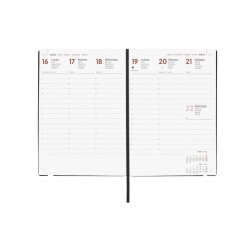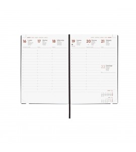 Agenda profesional encuadernada de tapa blanda y flexible. De tacto muy suave y gomoso. De estilo moderno y universal. Apertura perfecta. Con goma elástica y cinta-punto. Con esquinas microperforadas para localizar rápidamente el día/semana en curso. La anualidad contiene la información útil relativa a: onomástica, festivos nacionales, fases lunares, cambios de estación, cambios de hora e inicios del nuevo año chino, musulmán, ortodoxo y hebreo. La agenda incluye otros contenidos extra.