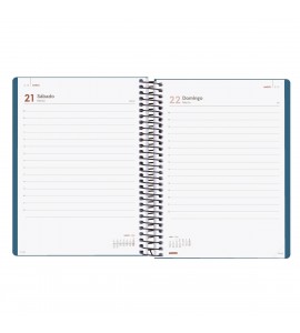Agenda de espiral de estilo moderno y universal con tapa dura de cartón forrado con peliculado mate antirrayaduras. Con goma elástica. Ideal para uso personal y/o profesional. Esquinas microperforadas para localizar rápidamente el día/semana en curso. Agenda con información de interés en la anualidad y otros contenidos extra.