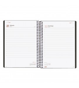 Agenda de espiral de estilo moderno. Con tapas dura de cartón forrado antirrayaduras y goma elástica. Formato cuartilla de sobremesa.