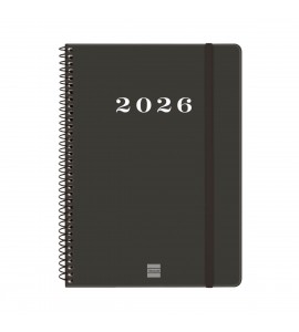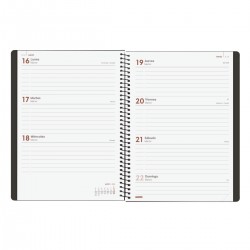 Agenda de espiral de estilo moderno y universal con tapa dura de cartón forrado con peliculado mate antirrayaduras. Con goma elástica. Ideal para uso personal y/o profesional. Esquinas microperforadas para localizar rápidamente el día/semana en curso. Agenda con información de interés en la anualidad y otros contenidos extra.