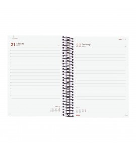Agenda de espiral de estilo moderno y universal con tapas ligeras de polipropileno. Con goma elástica. Con esquinas microperforadas para localizar rápidamente el día/semana en curso. Agenda con información de interés en la anualidad y otros contenidos extra.