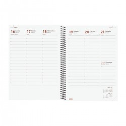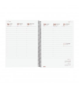 Agenda de espiral de estilo moderno y universal con tapas ligeras de polipropileno. Con goma elástica. Con esquinas microperforadas para localizar rápidamente el día/semana en curso. Agenda con información de interés en la anualidad y otros contenidos extra.