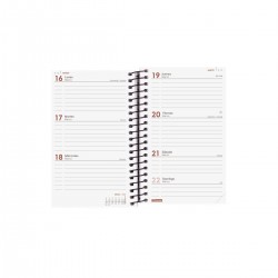 Agenda de espiral de estilo moderno y universal con tapas de polipropileno. Con goma elástica. Con esquinas microperforadas para localizar rápidamente el día/semana en curso. La anualidad contiene la información útil relativa a: onomástica, festivos nacionales, cambios de estación, cambios de hora e inicios del nuevo año chino, musulmán, ortodoxo y hebreo. La agenda incluye otros contenidos extra.