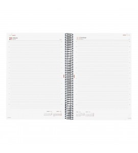Agenda de espiral de estilo moderno y universal con tapas de polipropileno. Con goma elástica. Con esquinas microperforadas para localizar rápidamente el día/semana en curso. La anualidad contiene la información útil relativa a: onomástica, festivos nacionales, cambios de estación, cambios de hora e inicios del nuevo año chino, musulmán, ortodoxo y hebreo. La agenda incluye otros contenidos extra.