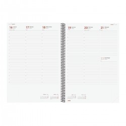Agenda de espiral de estilo moderno y universal con tapas de polipropileno. Con goma elástica. Con esquinas microperforadas para localizar rápidamente el día/semana en curso. La anualidad contiene la información útil relativa a: onomástica, festivos nacionales, cambios de estación, cambios de hora e inicios del nuevo año chino, musulmán, ortodoxo y hebreo. La agenda incluye otros contenidos extra.