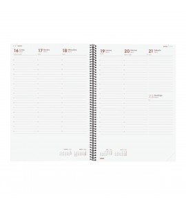 Agenda de espiral de estilo moderno y universal con tapas de polipropileno. Con goma elástica. Con esquinas microperforadas para localizar rápidamente el día/semana en curso. La anualidad contiene la información útil relativa a: onomástica, festivos nacionales, cambios de estación, cambios de hora e inicios del nuevo año chino, musulmán, ortodoxo y hebreo. La agenda incluye otros contenidos extra.