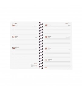 Agenda de espiral de estilo moderno y universal con tapas ligeras de polipropileno. Con goma elástica. Con esquinas microperforadas para localizar rápidamente el día/semana en curso. Agenda con información de interés en la anualidad y otros contenidos extra.
