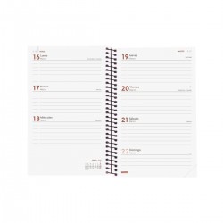 Agenda de espiral de estilo moderno y universal con tapas ligeras de polipropileno. Con goma elástica. Con esquinas microperforadas para localizar rápidamente el día/semana en curso. Agenda con información de interés en la anualidad y otros contenidos extra.