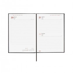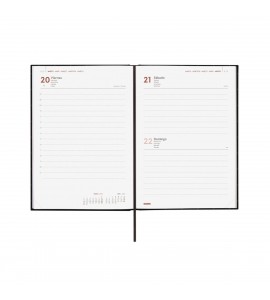 Agenda profesional encuadernada de estilo moderno. Tapa dura de cartón forrado con peliculado mate antirayaduras.
