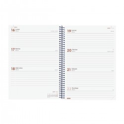 Agenda de espiral de estilo moderno. Con tapas de polipropileno y goma elástica. Ideal para uso personal y/o profesional. Con esquinas microperforadas para localizar rápidamente el día/semana en curso. La anualidad contiene la información útil relativa a: onomástica, festivos nacionales, cambios de estación, cambios de hora e inicios del nuevo año chino, musulmán, ortodoxo y hebreo. La agenda incluye otros contenidos extra.