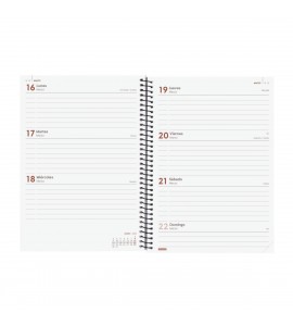 Agenda de espiral de estilo moderno. Con tapas de polipropileno y goma elástica. Ideal para uso personal y/o profesional. Con esquinas microperforadas para localizar rápidamente el día/semana en curso. La anualidad contiene la información útil relativa a: onomástica, festivos nacionales, cambios de estación, cambios de hora e inicios del nuevo año chino, musulmán, ortodoxo y hebreo. La agenda incluye otros contenidos extra.