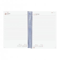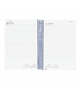 Agenda de espiral de estilo moderno. Con tapas de polipropileno y goma elástica. Ideal para uso personal y/o profesional. Con esquinas microperforadas para localizar rápidamente el día/semana en curso. La anualidad contiene la información útil relativa a: onomástica, festivos nacionales, cambios de estación, cambios de hora e inicios del nuevo año chino, musulmán, ortodoxo y hebreo. La agenda incluye otros contenidos extra.