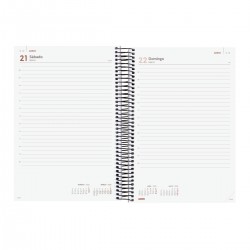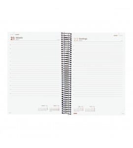 Agenda de espiral de estilo moderno. Con tapas de polipropileno y goma elástica. Ideal para uso personal y/o profesional. Con esquinas microperforadas para localizar rápidamente el día/semana en curso. La anualidad contiene la información útil relativa a: onomástica, festivos nacionales, cambios de estación, cambios de hora e inicios del nuevo año chino, musulmán, ortodoxo y hebreo. La agenda incluye otros contenidos extra.