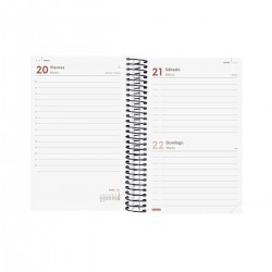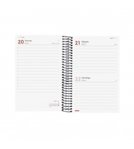 Agenda de espiral de estilo moderno. Con tapas de polipropileno y goma elástica. Ideal para uso personal y/o profesional. Con esquinas microperforadas para localizar rápidamente el día/semana en curso. La anualidad contiene la información útil relativa a: onomástica, festivos nacionales, cambios de estación, cambios de hora e inicios del nuevo año chino, musulmán, ortodoxo y hebreo. La agenda incluye otros contenidos extra.