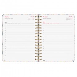 Agenda de espiral con tapa dura de cartón forrado con peliculado mate antirayaduras. Diseño elegante, en tendencia y a la moda, con detalles estampados metalizados. Ideal para uso personal y/o profesional. Con goma elástica. Con esquinas microperforadas para localizar rápidamente el día/semana en curso. La anualidad contiene la información útil relativa a: onomástica, festivos nacionales, cambios de estación y cambios de hora. La agenda incluye otros contenidos extra orientados a la organización personal.