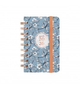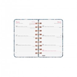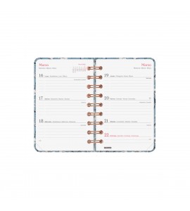 Agenda de espiral con tapa dura de cartón forrado con peliculado mate antirayaduras. Diseño elegante, en tendencia y a la moda, con detalles estampados metalizados. Ideal para uso personal y/o profesional. Con goma elástica. Con esquinas microperforadas para localizar rápidamente el día/semana en curso. La anualidad contiene la información útil relativa a: onomástica, festivos nacionales, cambios de estación y cambios de hora. La agenda incluye otros contenidos extra orientados a la organización personal.